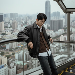 Outfit (must match): Oversized black leather bomber jacket layered over a brown knit vest with subtle black accents, worn on top of a crisp white shirt. Loose-fitting dark jeans. The styling should look premium and realistic, with visible fabric grain, leather shine, and natural folds.