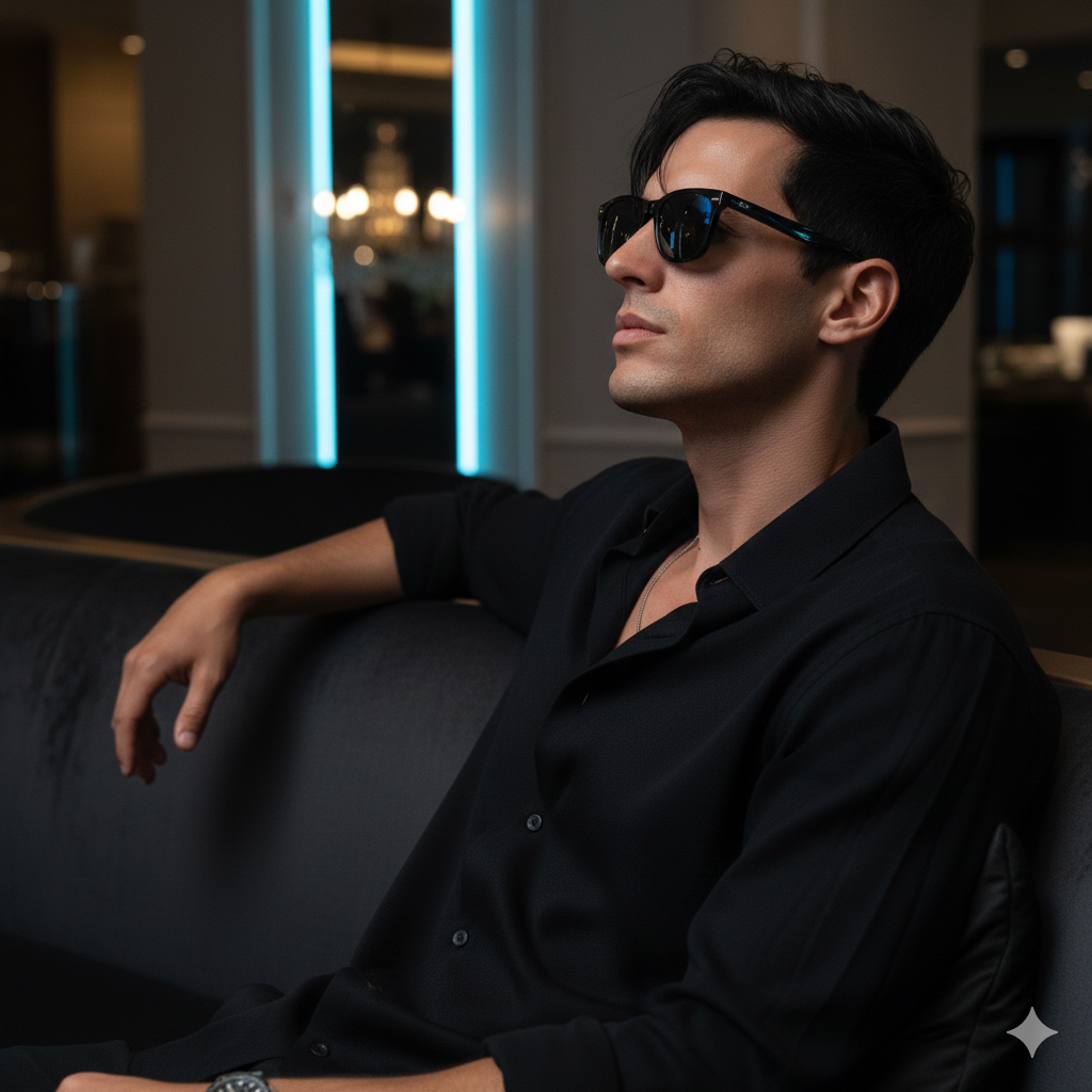 He is wearing an elegant black casual designer outfit with a sleek matte texture and precise tailoring, giving a subtle luxury fashion vibe. He wears modern black sunglasses with a faint reflective tint that softly catches ambient light.