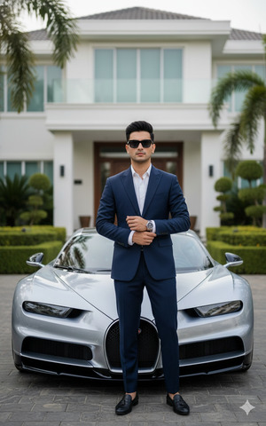 Create a hyper-realistic cinematic medium-wide shot of a confident and elegant man in his early 30s standing beside a sleek metallic-silver Bugatti Chiron. The car is parked in front of a pristine contemporary luxury mansion made of white stucco and glass, surrounded by manicured tropical greenery. He stands with a straight posture, one hand resting on the car hood and the other adjusting his suit cuff, expressing authority, confidence, and success. He is wearing a tailored navy-blue suit with a crisp white shirt (no tie), polished black loafers, and a minimal luxury wristwatch. He has a short, neatly groomed beard, styled black hair, and black designer sunglasses. Bright afternoon daylight with high-key cinematic lighting reflects on the car’s mirror-like surface, casting soft shadows and enhancing realistic skin texture. Palm trees and sculpted hedges appear in the background, reinforcing the exclusive tropical luxury vibe. Ultra-realistic, high quality, 8K resolution, cinematic lighting, realistic textures, shallow depth of field, DSLR photography style, shot on a Canon EOS R5 with an 85mm lens. Create the image in 9:16 aspect ratio.